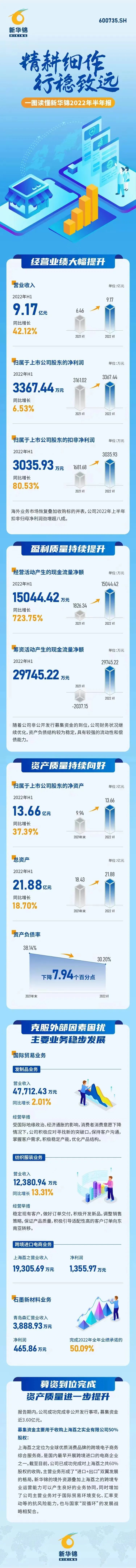 新华锦8月30日晚间披露2022年半年度报告,公司上半年实现营业收入9.17亿元,同比增长42.12%;实现归属于上市公司股东的扣除非经常性损益的净利润3035.93万元,同比增长80.53%;基本每股收益0.08元。经营活动现金流大幅改善,报告期内经营活动产生的现金流量净额为1.5亿元,同比增长723.75%。
